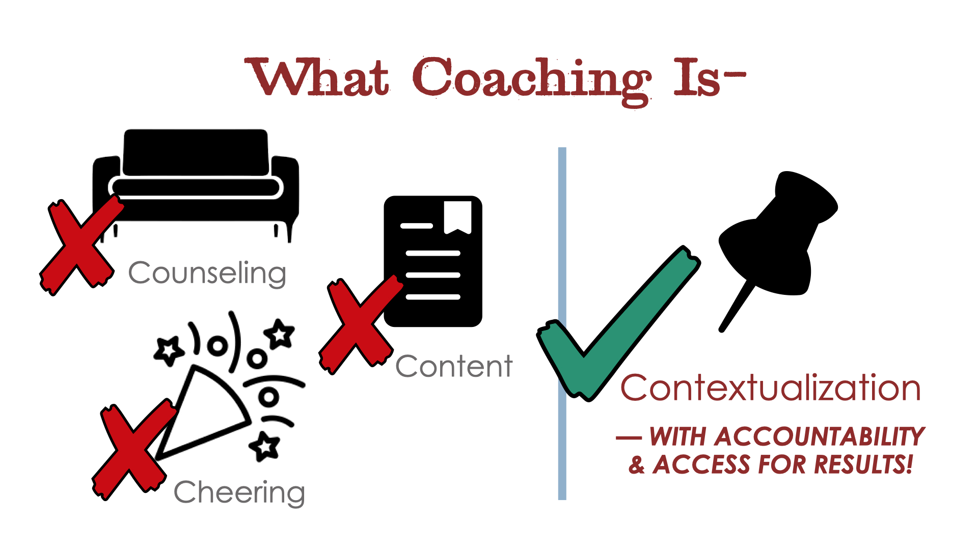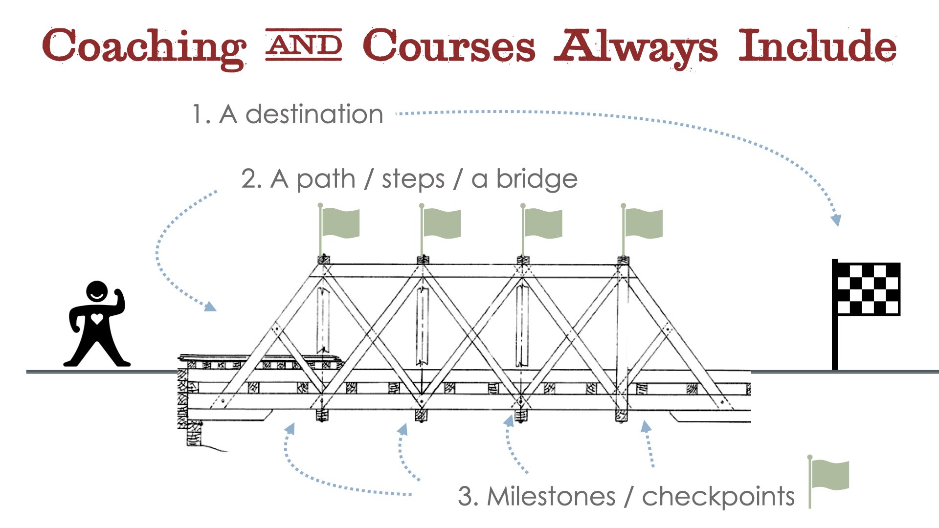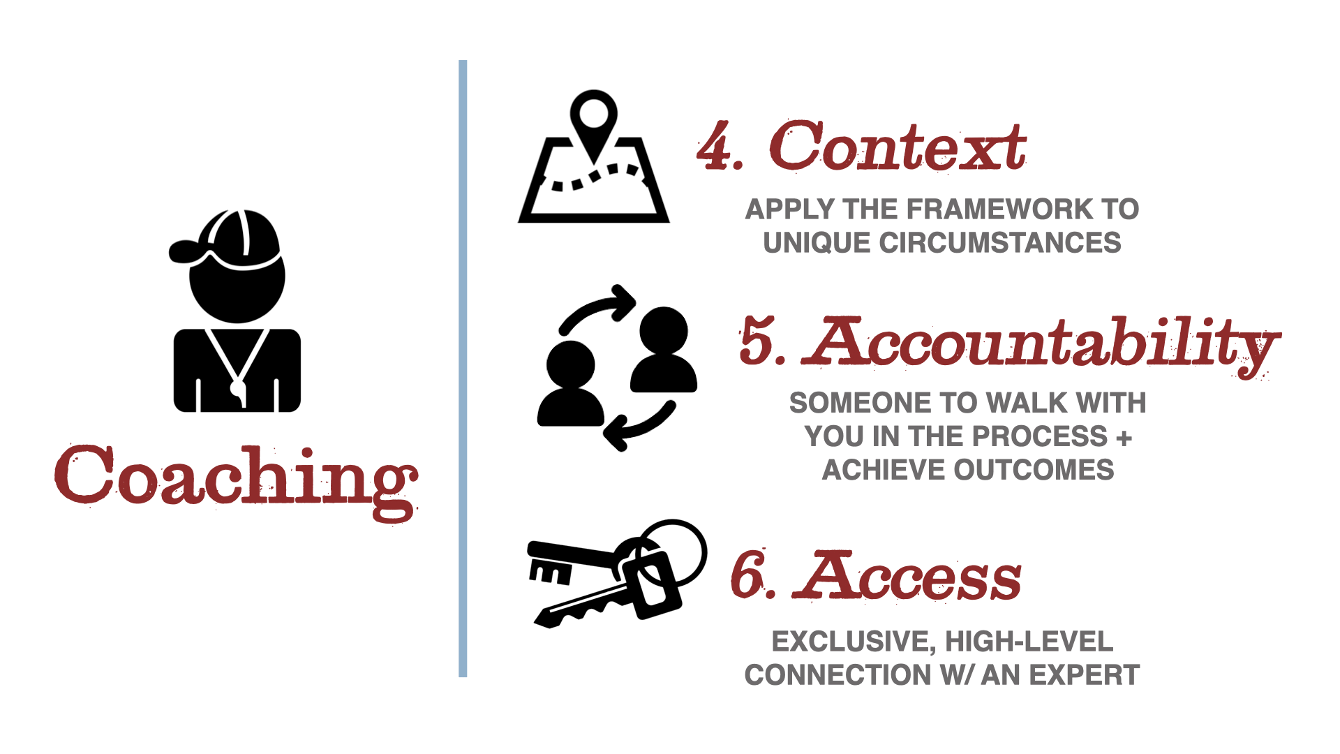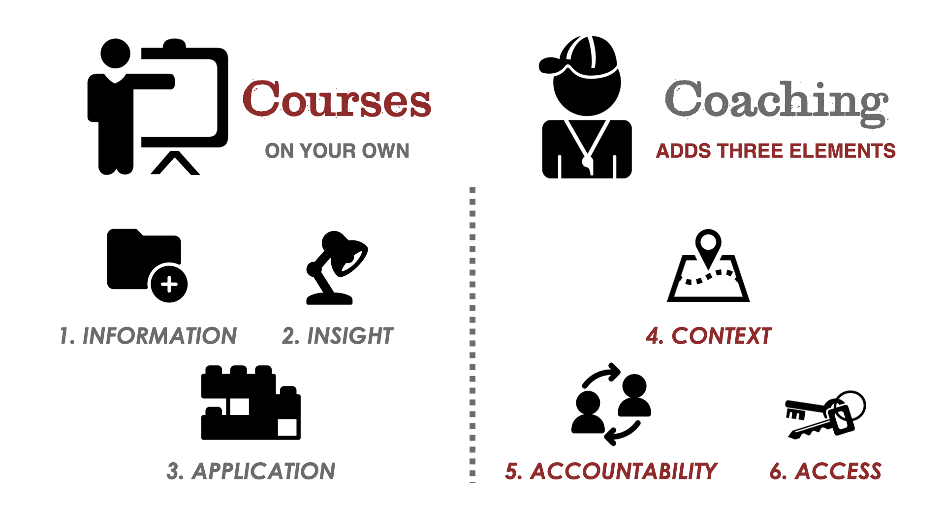 Coaching differs from courses in that it adds three more elements: context, accountability, and access.